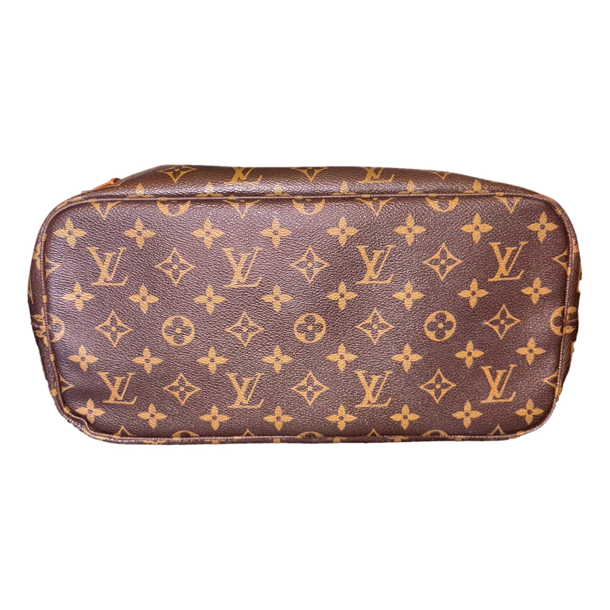 The Neverfull is designed with leather trim and features two sturdy top handles, allowing it to be comfortably carried by hand or over the shoulder. The wide, open-top design provides easy access to the interior, which is lined with a contrasting canvas and includes a secure key ring for added functionality.