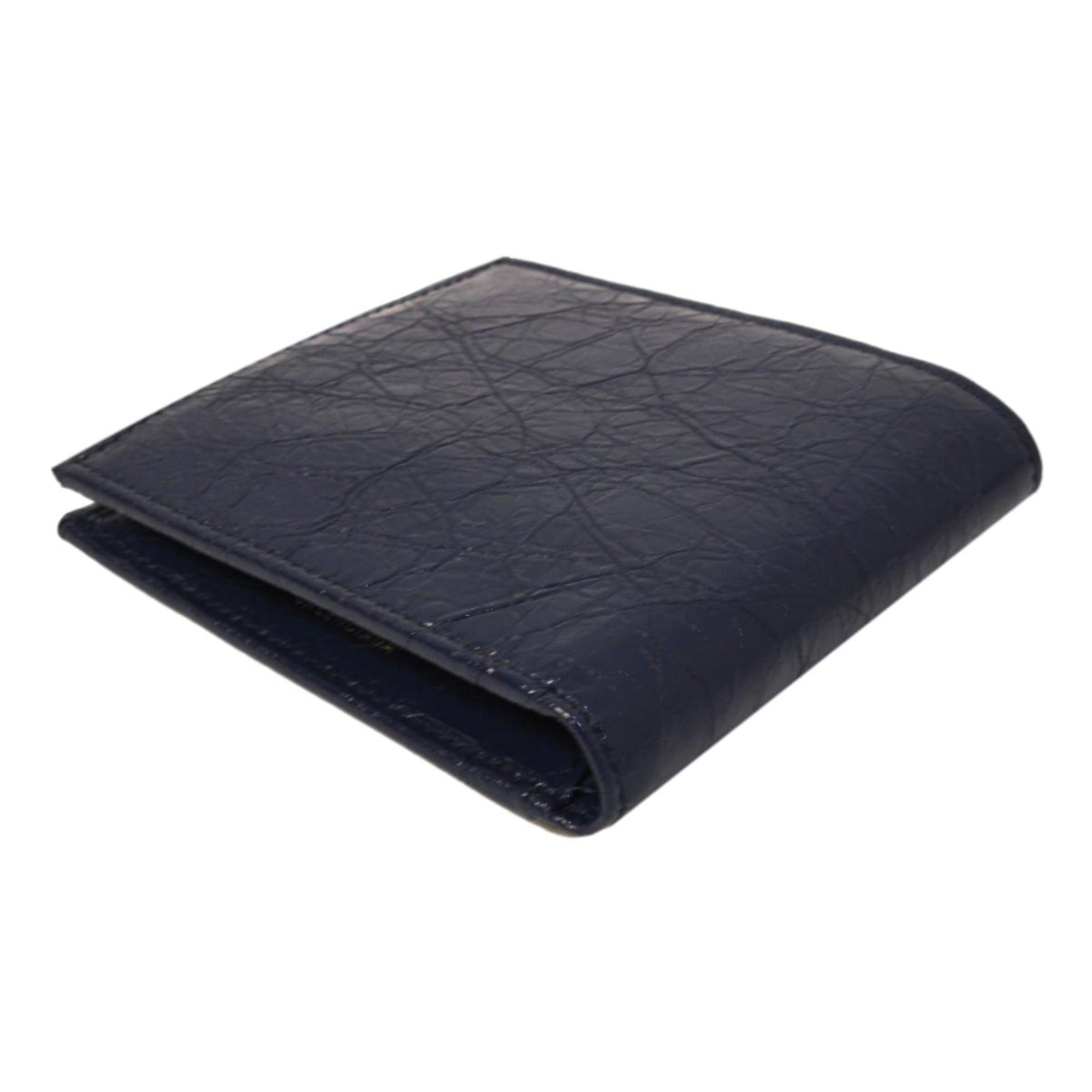 This bifold wallet is crafted of a shiny crinkled blue leather with two silver-tone stud details on the front face. The interior is made with the same blue calfskin leather and features card slots, bill slots, and a coin compartment. The clean design and functionality of this wallet make it perfect for everyday use!