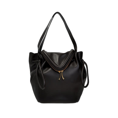This Large Beak Handbag in the color nero is crafted in supple calfskin leather. This gorgeous black leather handbag is the perfect every day bag to carry what you need day in and day out.  The design a bucket style with drawstring closure as well as top handles and a shoulder strap.