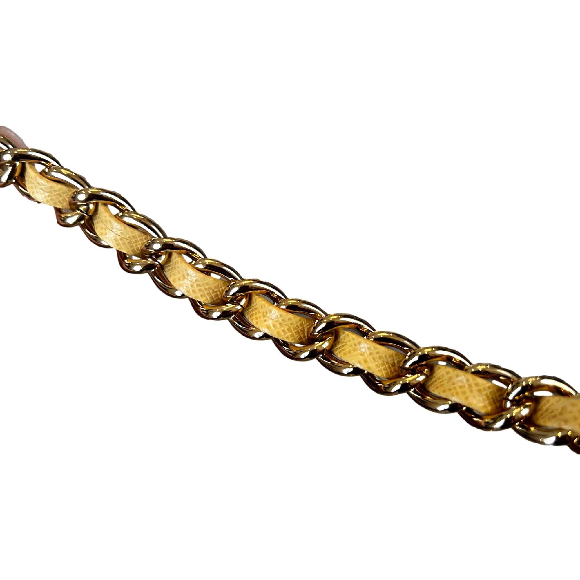 The softly padded structure is cloaked in an effervescent shade of golden yellow, refreshing and refined, exuding a subtle vibrancy that complements the bag’s sculptural form. Interlaced leather and polished chain handles evoke timeless glamour, gracefully juxtaposing the modern fabric with a nod to vintage sophistication.
