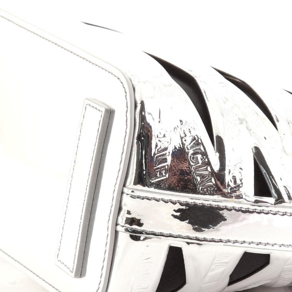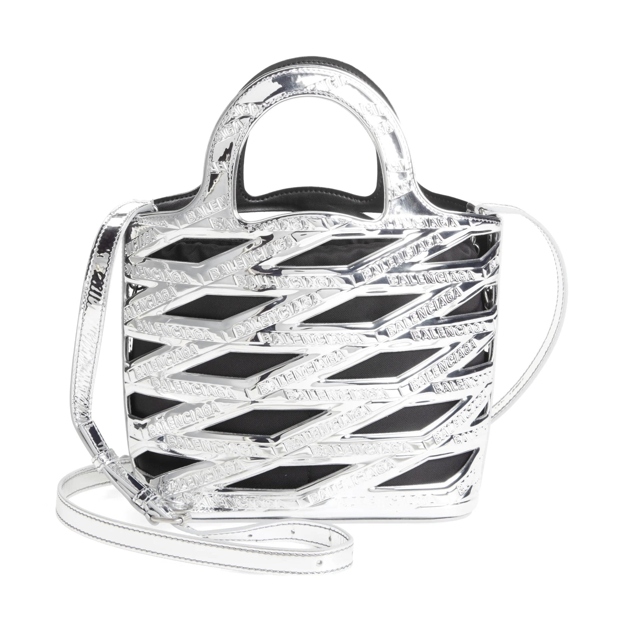 This eye-catching satchel from Balenciaga's "Neo" collection is crafted with an embossed metallic silver patent leather. The piece features cutouts throughout, a removable nylon organizer pouch, and a detachable leather strap for ease of wear. Turn heads with the Neo basket satchel, only from Balenciaga!