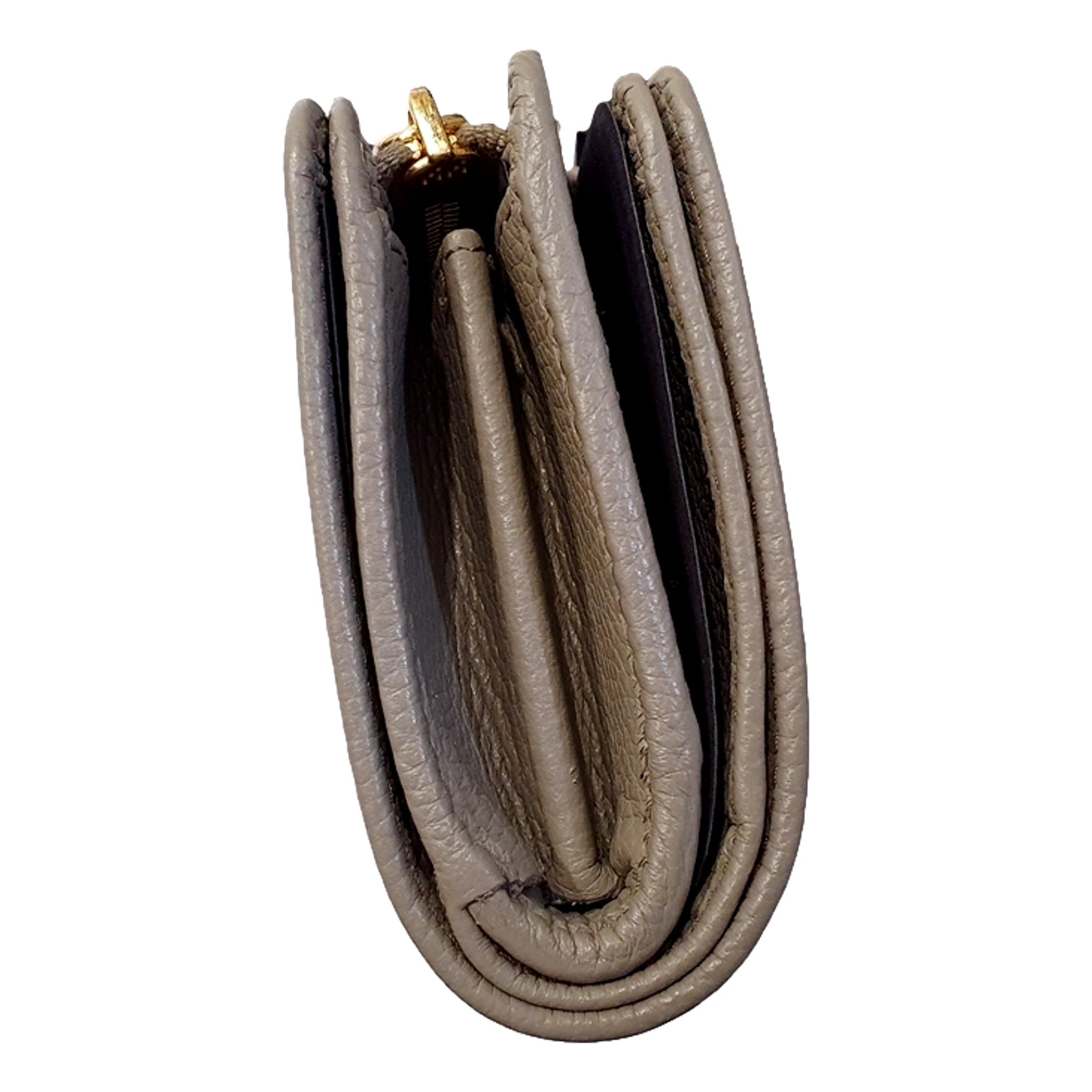 Prada Vitello Grain Argilla Grey Leather Small Wallet with Zipper Gold Plaque Logo