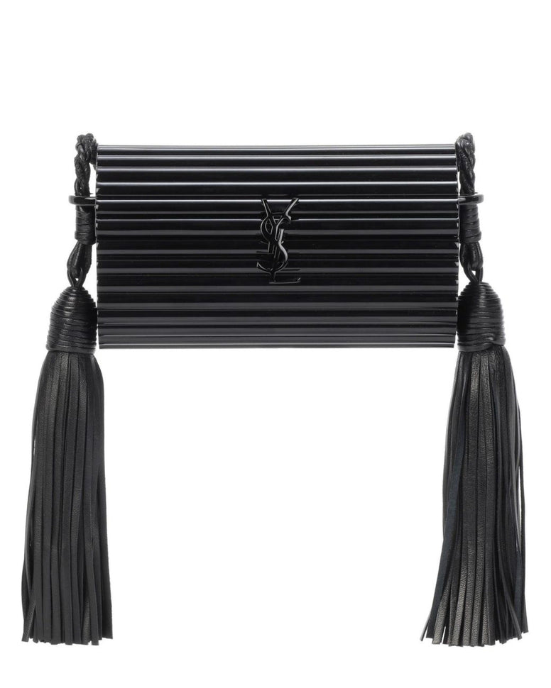 Saint Laurent Black Plexiglass Minaudière Opium Box Bag. Saint Laurent Plexiglass Minaudière Opium Box Bag - Black This bag is made of black ribbed plexiglass with black lambskin leather fringes on each side. Featuring a prominent black YSL monogram logo on the front. The flap opens to a black leather interior. Model 5173900