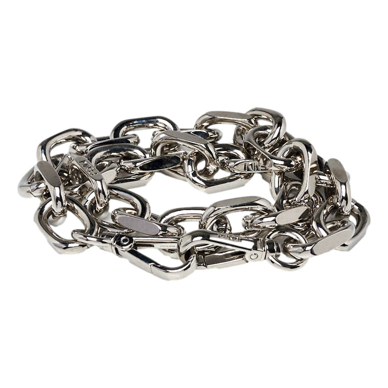 Crafted in Italy, this bold chain-link strap features polished silver-tone metal and signature Fendi detailing. Designed with dual clip attachments, it easily connects to compatible Fendi bags, transforming your look with modern edge and luxury hardware.
