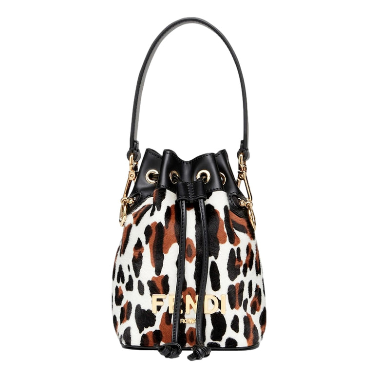 This iconic mini Mon Tresor bucket bag is crafted with animal printed sheepskin and features Fendi Roma lettering with a gold finish. Complete with a drawstring fastening, the compact interior easily carries essentials when you're on the go. It is conveniently equipped with two detachable straps - one handle and one crossbody. Add a touch of high fashion to your look with this exquisite accessory.